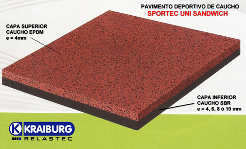 SPORTEC UNI SANDWICH está compuesto por una capa inferior, de espesor variable, que entrega las propiedades de absorción de impacto y deformación vertical del pavimento. Esta primera capa está fabricada con caucho negro reciclado aglomerado con elastómeros de poliuretano. Su presentación es en rollos x largo variable según espesor (4 , 6, 8 Y 10mm).