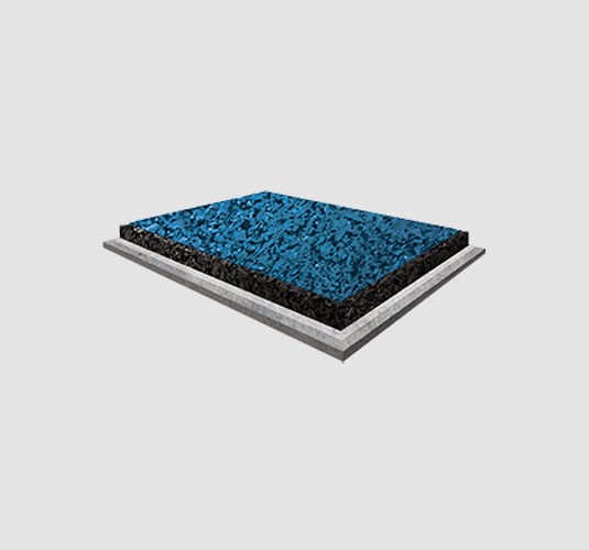 La capa inferior de caucho reciclado SBR se pega directamente sobre el radier utilizando adhesivos de poliuretano bicomponente especialmente diseñados para estas aplicaciones en exterior. Posteriormente, utilizando el mismo adhesivo, se pega la capa superior de caucho sintético EPDM directamente sobre la capa inferior.